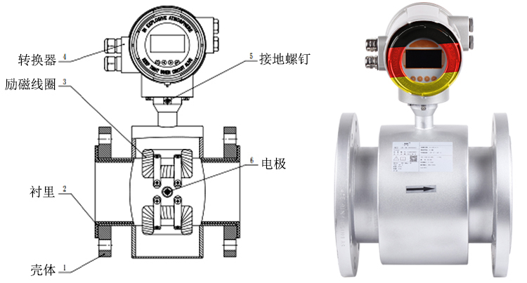 電磁流量計(jì)測(cè)量原理是基于法拉第電磁感應(yīng)定律。流量計(jì)的測(cè)量管是一內(nèi)襯絕緣材料的非導(dǎo)磁合金短管。兩只電極沿管徑方向穿通管壁固定在測(cè)量管上。其電極頭與襯里內(nèi)表面基本齊平。勵(lì)磁線圈由雙向方波脈沖勵(lì)磁時(shí),將在與測(cè)量管軸線垂直的方向上產(chǎn)生一磁通量密度為B的工作磁場(chǎng)。此時(shí),如果具有一定電導(dǎo)率的流體流經(jīng)測(cè)量管,將切割磁力線感應(yīng)出電動(dòng)勢(shì)E。電動(dòng)勢(shì)E正比于磁通量密度B、測(cè)量管內(nèi)徑d與平均流速V的乘積,電動(dòng)勢(shì)E(流量信號(hào))由電極檢出并通過電纜送至轉(zhuǎn)換器。轉(zhuǎn)換器將流量信號(hào)放大處理后,可顯示流體流量,并能輸出脈沖,摸擬電流等信號(hào),用于流量的控制和調(diào)節(jié)。