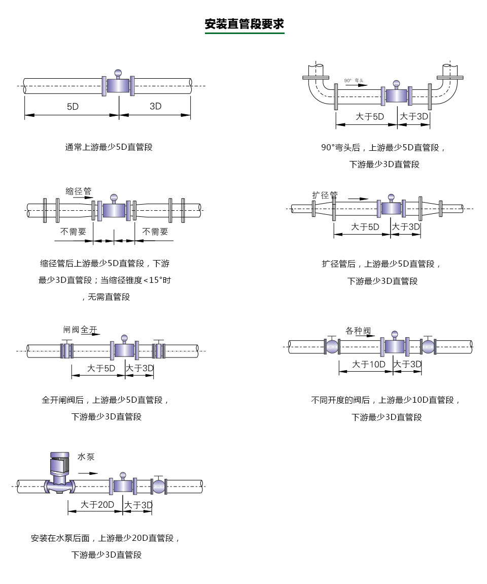 流量計對安裝點的上下游直管段有一定要求,否則會影響測量精度,詳細見如下各圖。
