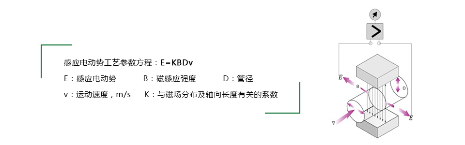 進口電磁流量計廣泛用于測量導電液體和液固兩相流體的體積流量,其測量原理是根據法拉第電磁感應定律,如下圖所示,上下兩端的兩個電磁線圈產生恒定或交變磁場,當導電介質流過電磁流量計時,做切割磁感線運動,此時會產生一個感應電動勢并被兩測量電極檢測出來,這個感應電動勢大小與導電介質流速、磁場的磁感應強度、導體寬度(流量計測量管徑)成正比,再通過運算就可以得到介質流量。