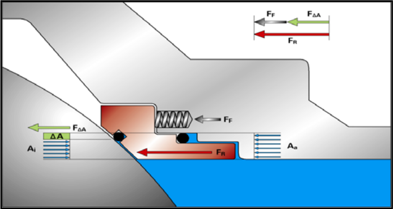 附圖 2.1 Double Piston Effect (DPE)結(jié)構(gòu)及密封原理示意圖(干線壓力對(duì)閥座作用力)